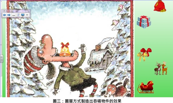 共讀活動:教師提問 ‘What did the old lady swallow?’ ‘What’s the second thing she swallowed?’ ‘What comes next?’ ‘Please write down the target words’ 學生將 old lady 吞的物件放入嘴巴中,這個是透過圖層概念的方式,先擷取並增加一張相同的 old lady 的嘴巴至最上層,再鎖定位置(請勿合併圖片),這樣將物件放入嘴中在視覺上感覺消失了,即製造出吞嚥物品進去肚子裡的效果(見圖三)。