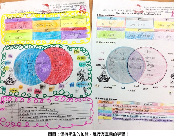 透過教師自編資訊教學媒材的融入,提升課堂中師生的高度互動性。同時,教師也重視每一位學童都能夠有參與學習活動的機會。此外,顧及學生個別程度差異,座位的安排採異質性分組,以兩兩一組完成任務。最後,學生在課堂中進行多元活動如閱讀理解和讀者劇場,活用音韻拼音規則,提升口語流暢度,也讓學生撰寫出創意的學習作品,具體展現英語力!