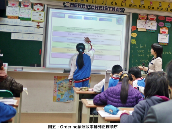1. Pair work:學生異質性分組(heterogeneous grouping)完成重組句型條,請一位學生用電子白板 Notebook 中的 ‘ordering’ 依照故事發展順序排出正確答案(見圖五),但是教師在編輯教材時要注意英語拼寫的正確度,Edit 在這部份沒有自動檢查拼字的功能。