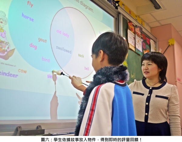 資訊產品導入教學現場,可以提高學生的學習動機和師生互動性,也可以立即檢視學生給予評量,對於台下的其他學生,教師則可以在此時去關注各組學生的任務是否正確完成。目前並無所謂的套裝軟體或是活動可現成使用,但是讓教學者的我,更能去思考如何妥善地運用並創意地自編電子白板的活動,讓我的學生除了教科書學習之外,還有資訊融入英語閱讀教學,讓他們從小就愛上英語!