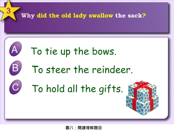 4. 閱讀理解策略題目:為了讓教學更加流暢,教師可以先在正確答案旁邊加入一個答對的小圖示,用 Click and Reveal 按一下就會淡出顯示出圖案,這樣在課堂中就可以很快地檢核答案(見圖八)。