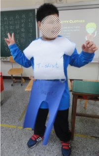首先,要澄清的是,「多媒體工具」絕對是老師教學的「利器」,但非教學的全部。所以,當我們進行「我們在衣起」的單元教學時,我們設定了五個與衣物相關的單字,包括:T-shirt、pats、skirt、shoes、hat,而我們的教學活動由「唱」到「說」;由「說」到「寫」;由具體身上穿的衣物、到描畫出這些衣物,並且將這些畫下來的衣物貼在自己的身上,然後再將這些學到的單字寫下來,貼在這些衣物上。在反覆練習並熟悉指定的單字之後,才會讓「神桌」出場。