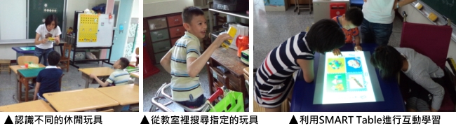 學期中,我們嘗試利用第二個單元─「做伙玩休閒」,進行 Table 的教學應用,我們設定的英文單字是:toy plane、toy car、block、ball。同樣先透過具體物的介紹,讓小朋友先認識這些玩具的英文名稱;接著由老師說出這些玩具的英文名稱,請小朋友在教室裡找一找,教室裡是否還能找到其他老師所指定的玩具呢?經由「認識」、「觸摸」、「玩」的過程,小朋友不斷的重複聆聽這些指定的英文單字,接下來就是「寫」了,把寫好的英文單字依照老師的指令,貼在指定的玩具上,最後就可以用 SMART Table 讓小朋友們進行重複性的練習及評量囉!