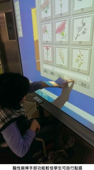 本人這學期開始導入電子白板教學,課程使用在特殊教育休閒與綜合領域課程:電腦社。本班學生共有 12 位同學,經過電腦使用評估後有 2 位腦性麻痺學生使用滑鼠及鍵盤困難,故改用搖桿及按鈕,其他 10 位同學約 5 位可使用滑鼠與鍵盤輸入中英文,其餘五位因認知嚴重缺損無法打入有意義的常用字。以上學生因為異質性頗大,所以電腦教室的鍵盤滑鼠及螢幕可能就會造成部份學生的障礙而不是學習工具。電子白板的導入,可在同一主題進行多層次教學,讓學生僅使用點選或是書寫的方式來進行教學與學習,之後再讓學生透過個人電腦的個別學習,產生較多的互動與提高學習成效,而不是老師僅透過廣播系統讓學生面對螢幕,這種學習對於需要多元刺激或僅能擁有限制性輸入的學生或是必需個別指導切割到非常細步驟的學生具有友善性、即時性與互動性。
