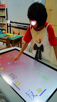 SMART Table 搭配簡單易用的教材編輯軟體,提供多元化的教學模版,包含配對、分類、選擇和手繪練習模式等。剛開始設計教材時,本來擔心會花較久的時間學習如何編輯一份學習教材,先訂目標從學生最常接觸國語領域出發,以每一課的生字解析為開發的方向,如生字讀音、注釋以及相關的詞語應用等內容,由於教學模版的操作簡單易懂,現在大約花半小時即可完成簡單的練習活動,再傳到 SMART Table 內就可以立即使用。