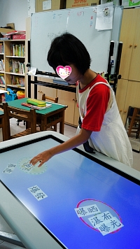 在國語課的教學中,老師會在每篇課文結束前,帶領著孩子們花 5-10 分鐘的時間複習課堂中的教學內容,由於資源班學生人數較少,每個孩子們都有機會使用 SMART Table 練習 3-5 分鐘,答題正確 Table 還會發出不同的聲音回饋,有效鼓勵學生參與學習。在每位同學分別做完練習後,老師會再一起和孩子們重新完成活動,並針對學習弱點加以指導,以加深孩子們的印象。