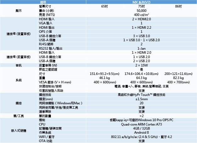 3種尺寸– 65吋,75吋,86吋