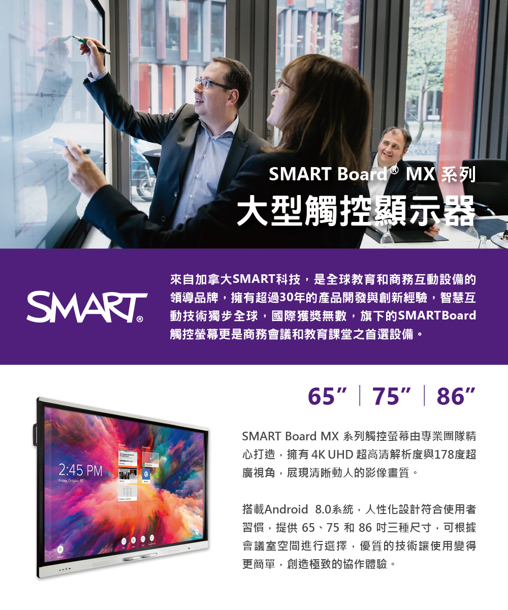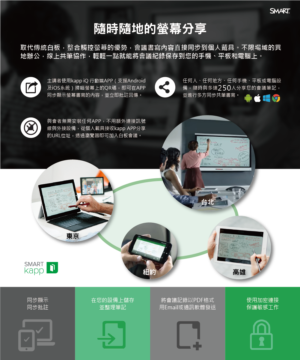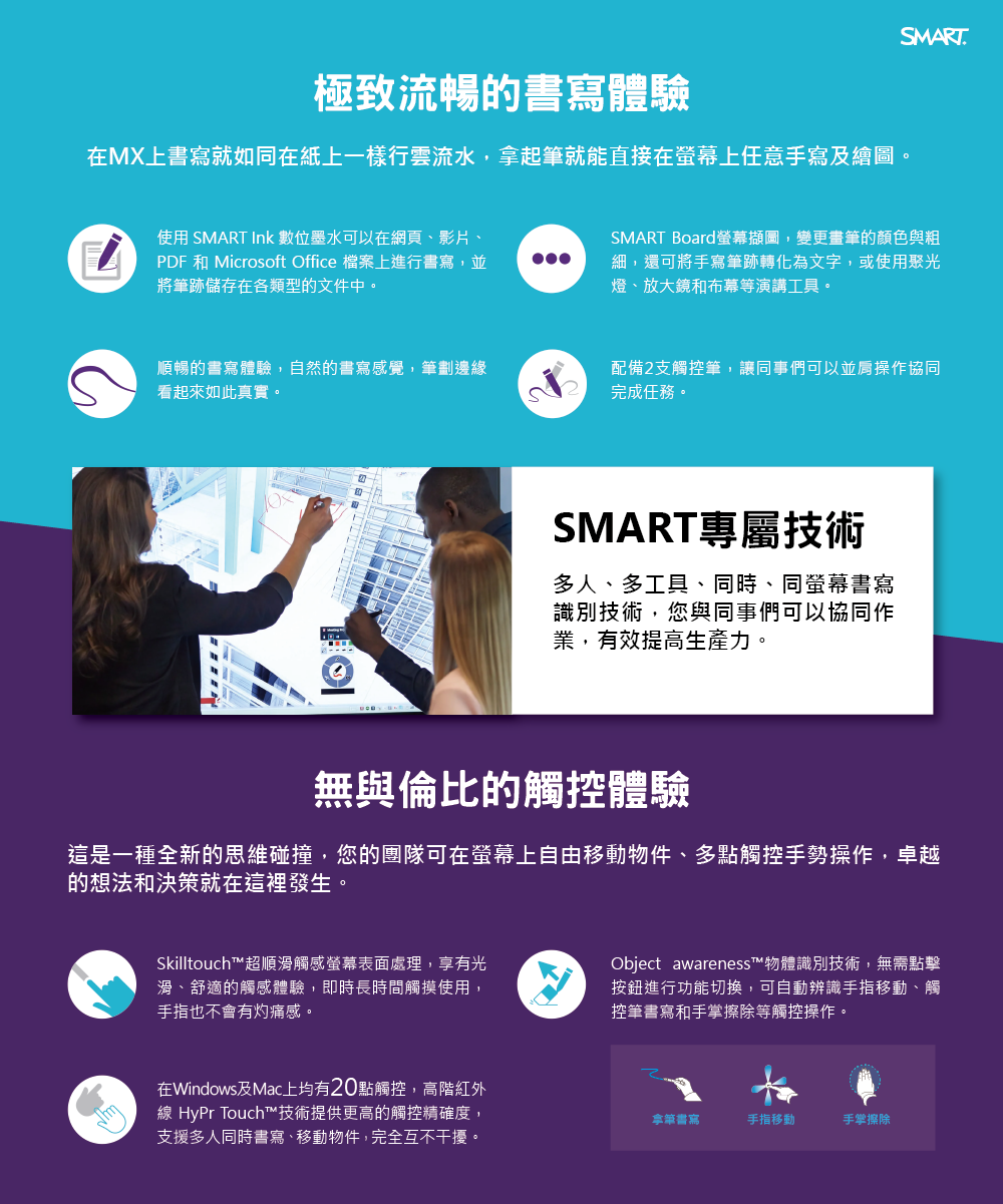 SMART Board 互動式觸控設備提供強大的協作解決方案,專為使用者而設計,將團隊、技術、軟體和個人載具整合成一個有凝聚力的