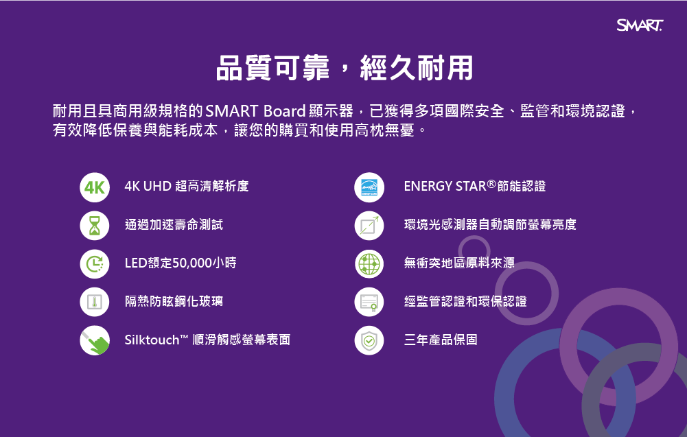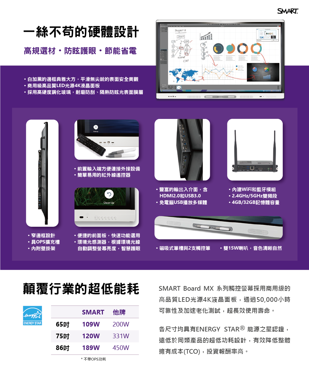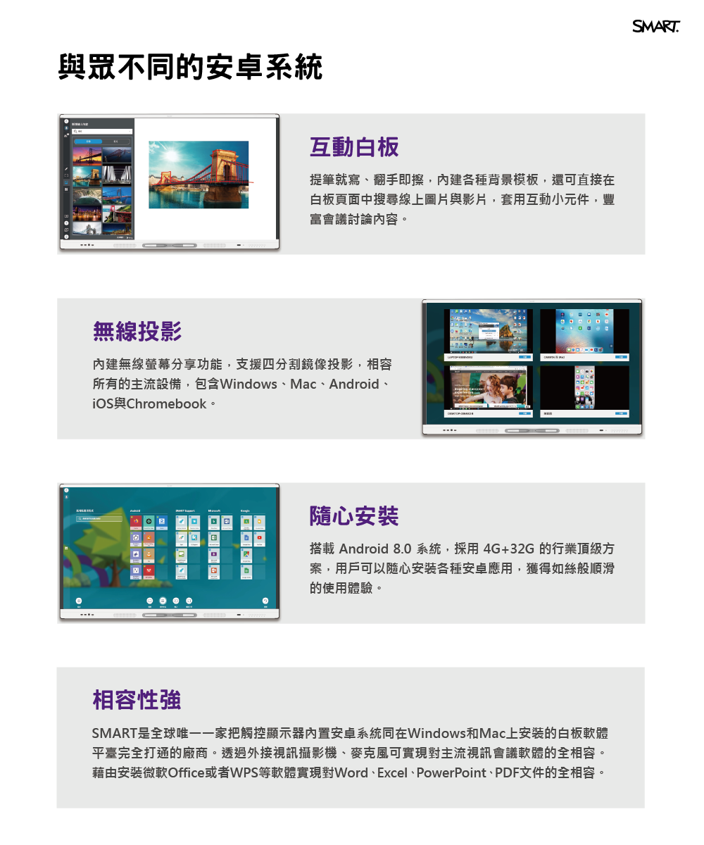 SMART Board 互動式觸控設備提供強大的協作解決方案,專為使用者而設計,將團隊、技術、軟體和個人載具整合成一個有凝聚力的